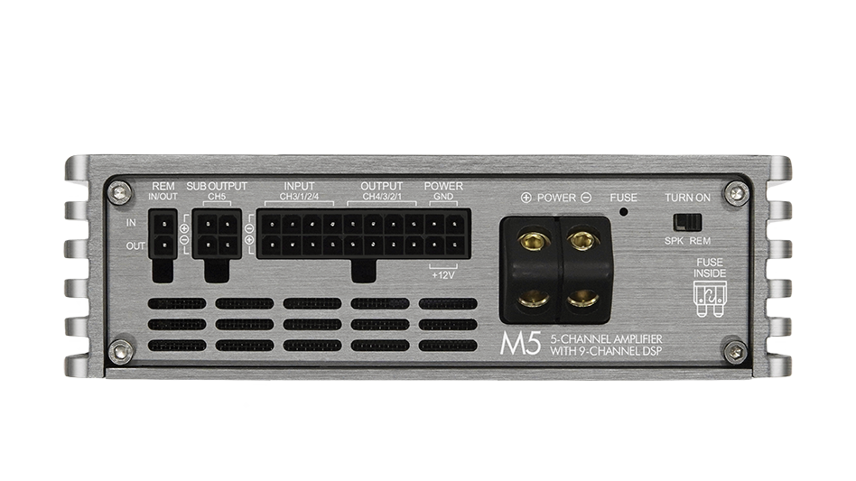 Chỉ lớn hơn một chiếc điện thoại di động một chút, M5 vừa vặn với những không gian nhỏ nhất. Mặc dù có nhiều bộ khuếch đại Class-D nhỏ, nhưng không có bộ nào trong số chúng cung cấp công suất đầu ra 500 watt RMS và DSP 9 kênh tích hợp ở kích thước này. Bộ khuếch đại đa năng này có thể tỏa sáng như một thành phần chất lượng cao trong một hệ thống cao cấp tinh vi hoặc dễ dàng lấp đầy âm thanh cho một chiếc xe. Nó có được tính linh hoạt ấn tượng nhờ DSP 9 kênh, tích hợp liền mạch các thành phần bổ sung với bốn kênh bổ sung có thể sử dụng bên ngoài. Bất kể bạn muốn hiện thực hóa hệ thống âm thanh nào, M5 là khoản đầu tư có khả năng thích ứng hoàn hảo ngay cả khi bạn mở rộng sau này mà không cần phải thay thế. Bốn kênh RMS 50 watt mạnh mẽ có sẵn cho các hệ thống thụ động phía trước và phía sau – và ngay cả đối với loa siêu trầm, với công suất 300 watt ở 2 ohm ở chế độ hoạt động, vẫn còn rất nhiều năng lượng còn lại.